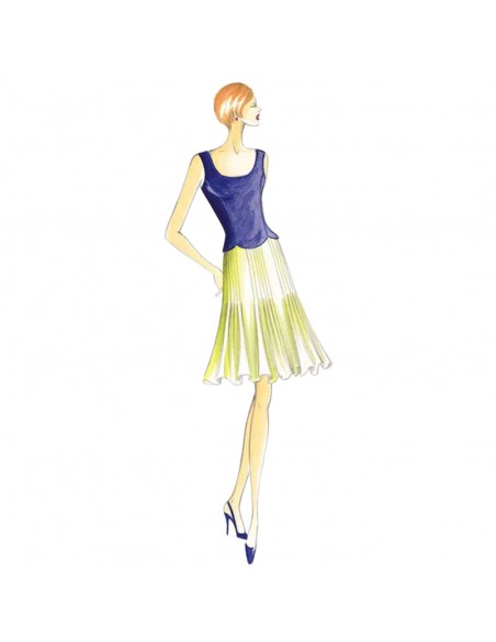 Jupe réalisable en voile ou crêpe de chine avec groupes de plis fermés qui s’ouvrent au bas. Complétée par un top moulé. Veste n. 9837.