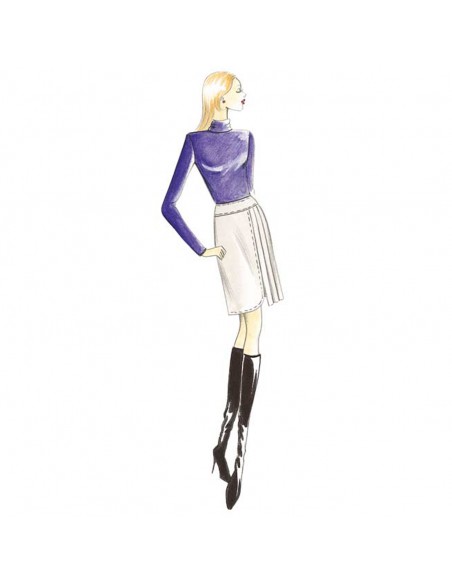 This youthful skirt simulates a kilt. It has a shaped waistband and rounded hemline with side pleats.
