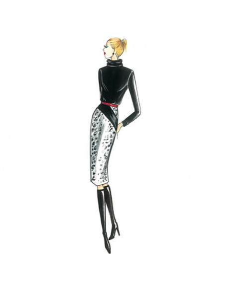 Jupe midi avec un original pan qui part du devant et continue dans le dos avec fentes et zips.