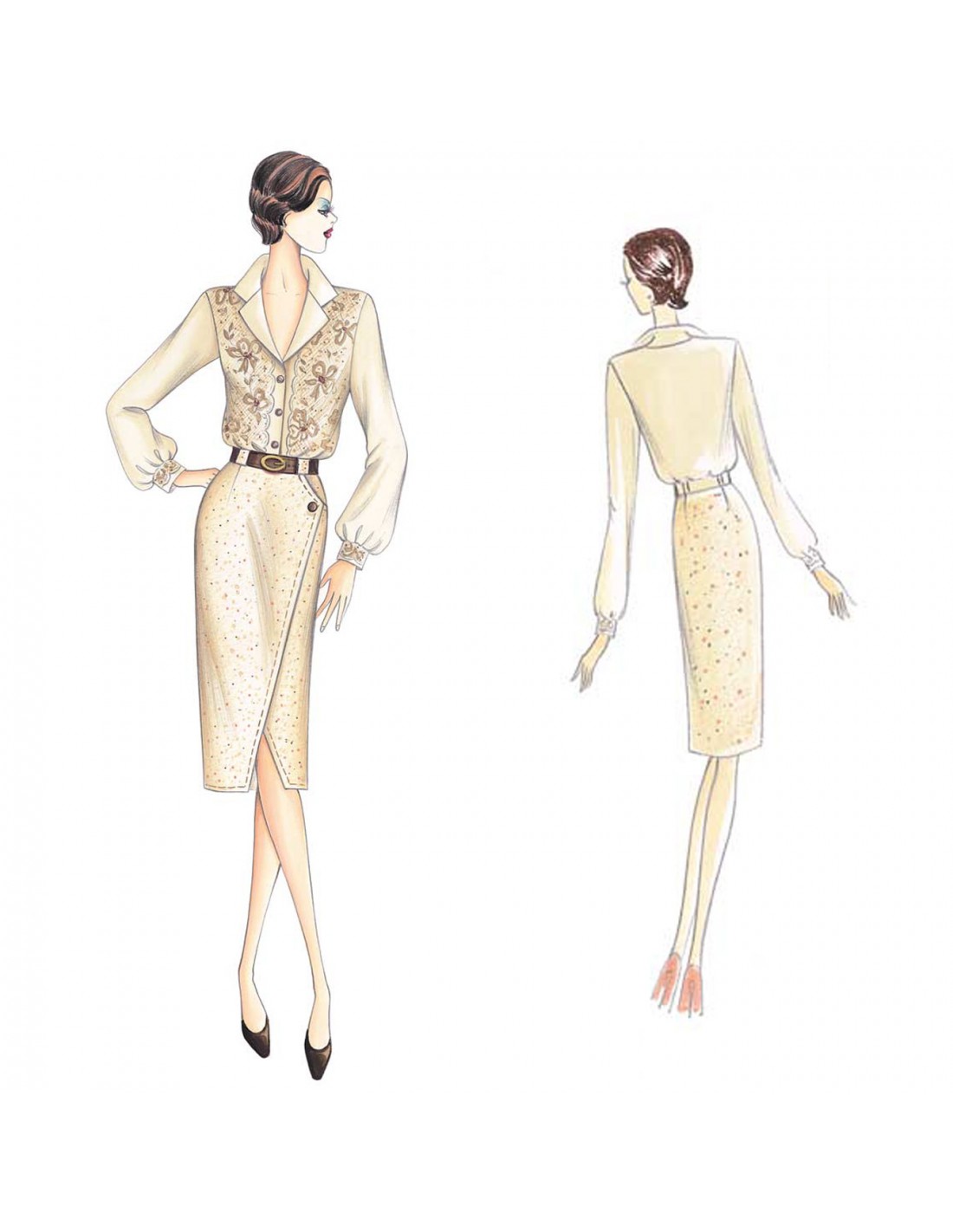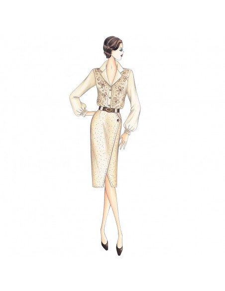 Jupe de ligne droite avec panneaux croisés coupés en diagonale avec ouverture au bas et une seule poche. Réalisable en tweed, gabardine, crêpe. Blouse n. 8496.