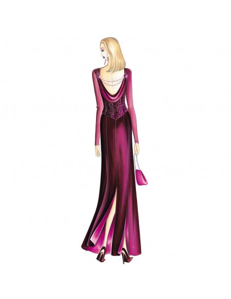 This long dress is straight and divided into panels with slits at the back and a colorful sateen lining. Suggested fabric: velvet or silk crêpe. Bustier n. 1542.