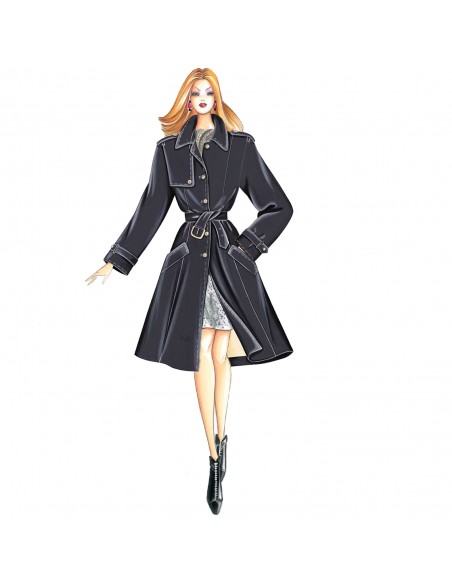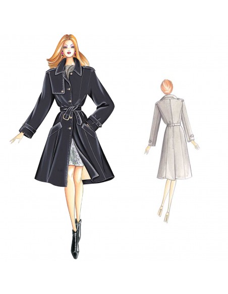 Trench droit avec coupes redingote, bandes et empiècement fixés par des boutons.
