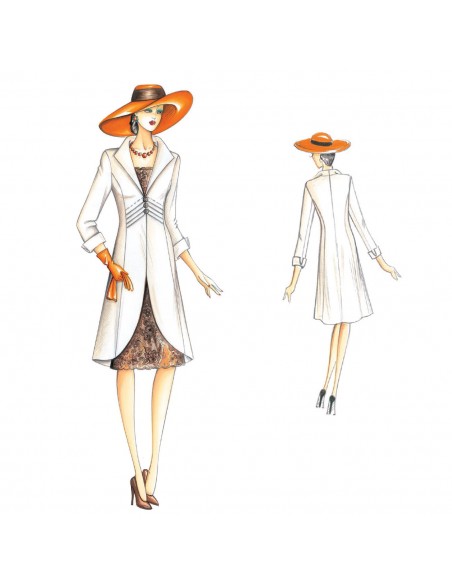 Pardessus de ligne redingote, col à pointes relevées, motif de petits plis à la taille, ouverture bord à bord, boutonnières en boucle, manchettes rabattues. Tissu conseillé crêpe, satin ou lainage.