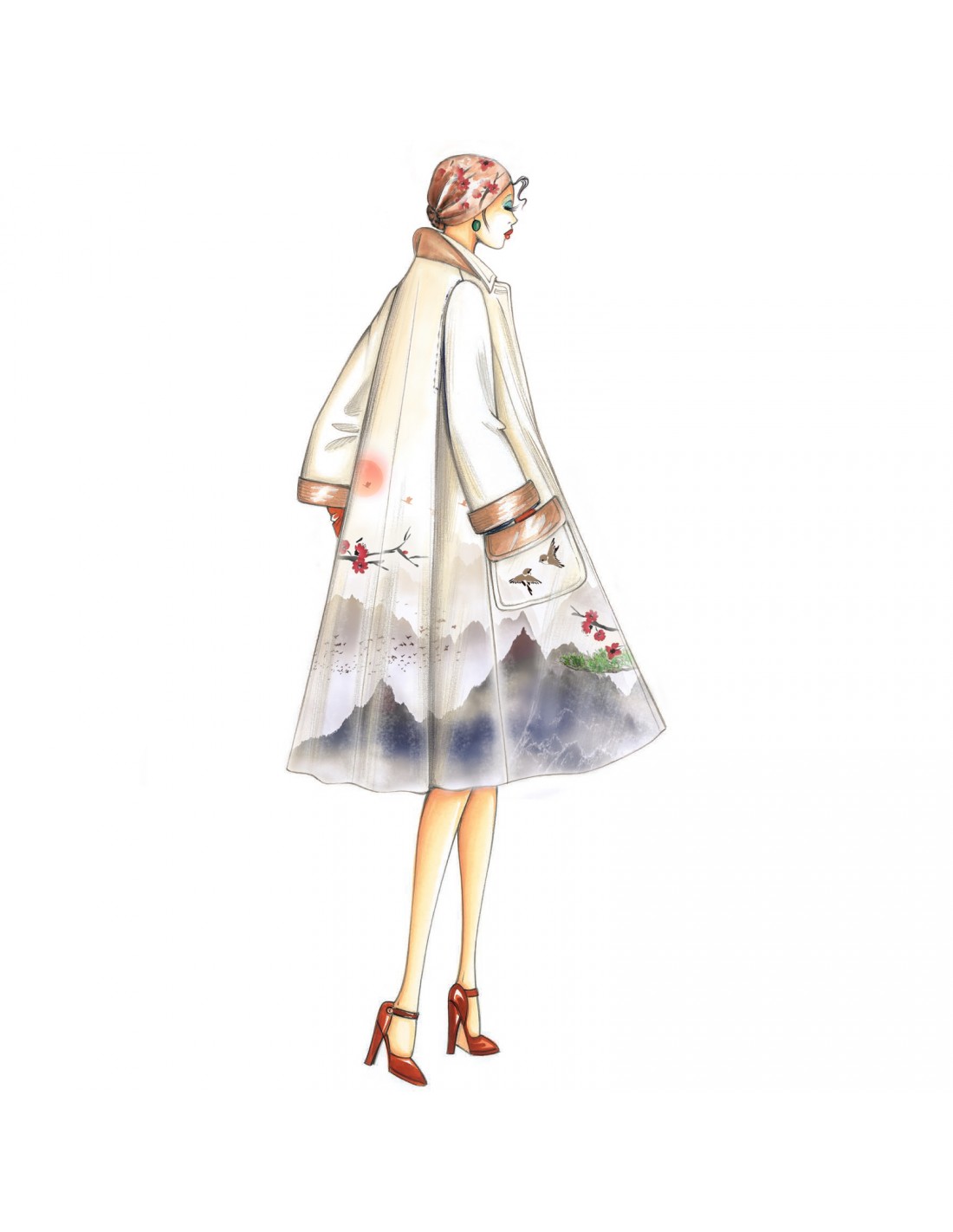 Manteau de ligne trapèze plus ample dans le dos avec un souple pli vers le côté, col chemise, manches et poches rabattues. Tissu conseillé cachemire double-face, velours imprimé ou panne légère.