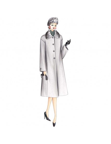 Manteau droit de ligne évasée avec col de fourrure, manches montées basses avec petite fente aux poignets fermée par un bouton et poches intérieures. Réalisable en tweed, lainage, velours.