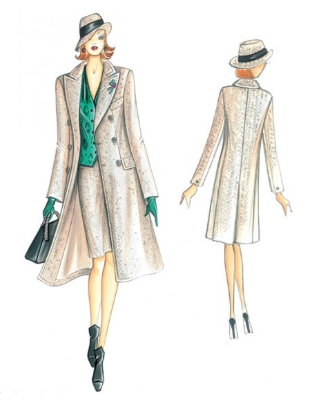 Manteau croisé double en tissu chevron, ligne classique avec revers en pointe et rabats avec poches intérieures.