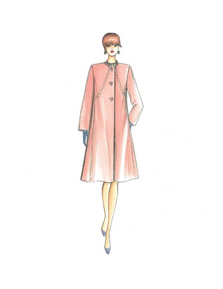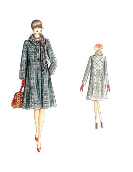 Manteau de ligne mi-moulée sur le devant et plus ample dans le dos avec une poche intérieure insérée au côté, ras-du-cou, écharpe retenue sur le devant et laissée libre. Egalement realisable sans écharpe. Conseillé en laine écossaise, tweed, laine peignée.