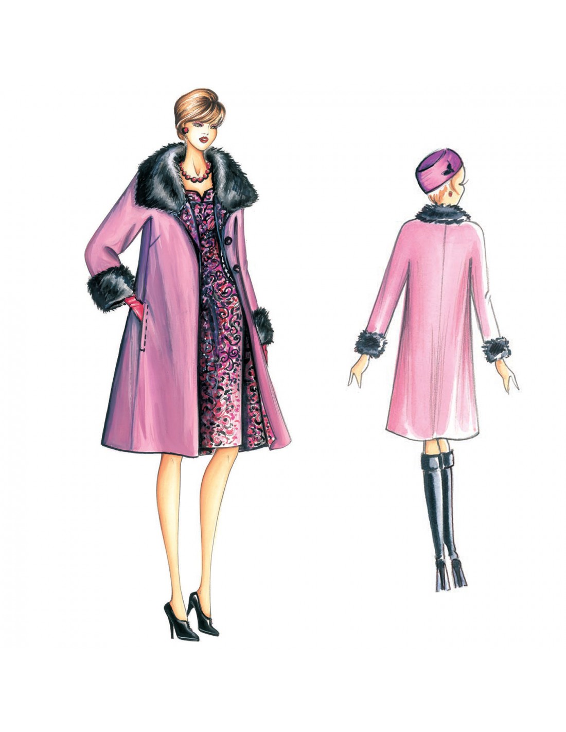 Elégant manteau droit de ligne évasée avec un ample col à pointes tombantes, kimono avec l’emmanchure sous la manche, poches intérieures. Réalisable en velours ou panne. Robe n. 3233.