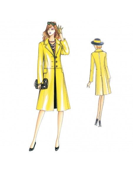 Manteau de ligne cintrée évasé au bas avec une coupe qui souligne le tour de taille légèrement rabaissé, rabats insérés. Réalisable en drap de laine ou vigogne.