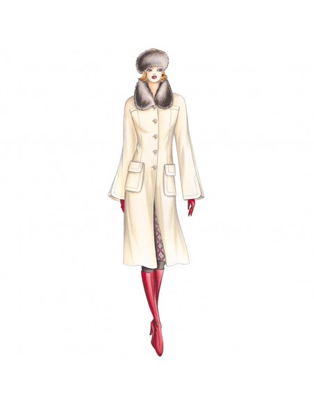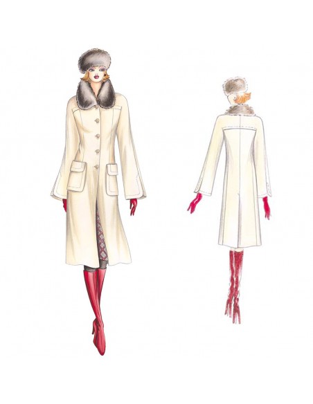 Manteau droit de ligne redingote souple avec manches en marteau évasées et fendues au milieu, poches plaquées qui créent un rabat et col de fourrure. Réalisable en lainage, velours, cachemire.