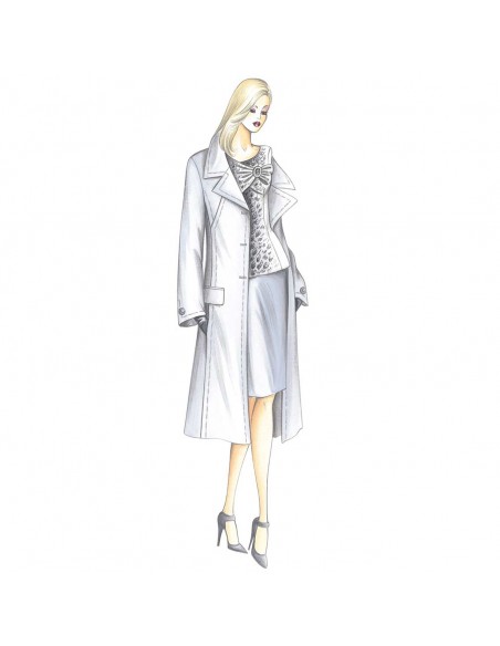 This single-breasted coat is slightly flared, has flaps and inset pockets. Suggested fabric: velour. Blouse no. 1127.