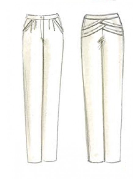 Ligne fuselée au bas pour le pantalon avec, dans le dos, une basque à bandes arrondies et croisées. Réalisable en denim. suédine, laine froide.