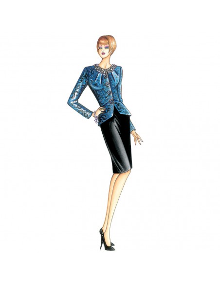 Elégante veste de ligne moulée à réaliser en velours ou brocart, encolure bijou garnie par un bord en perles, souples pinces, petite basque qui marque le tour de taille et descend le long du dos.
