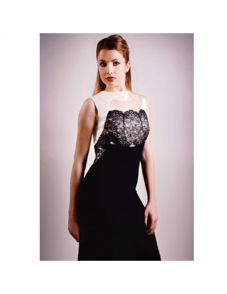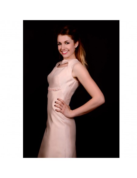 La robe a une ligne mi-moulée évasée au bas, le corsage divisé en deux parties crée sur le milieu une ouverture arquée parallèle à la coupe empire.
