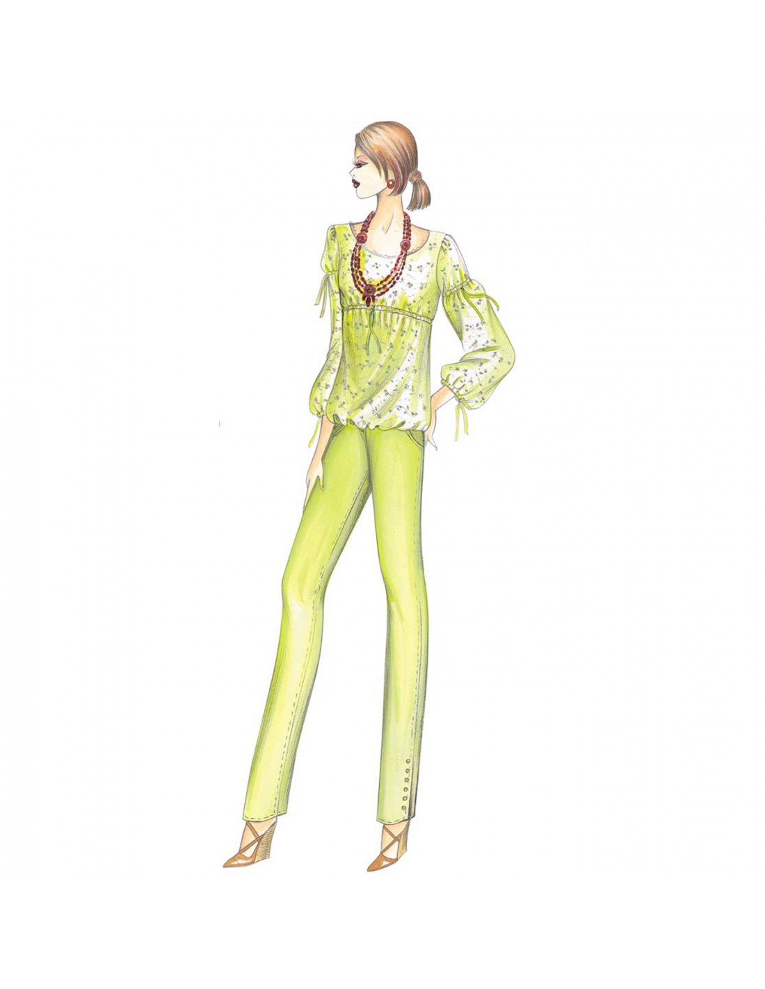Pantalons jeans de ligne fuselée avec fente au bas fermée par des petits boutons, poches intérieures arrondies et coupe en pointe dans le dos. Blouse n. 1294.