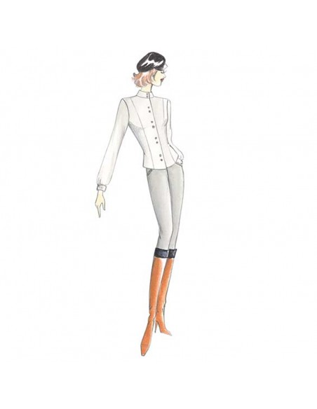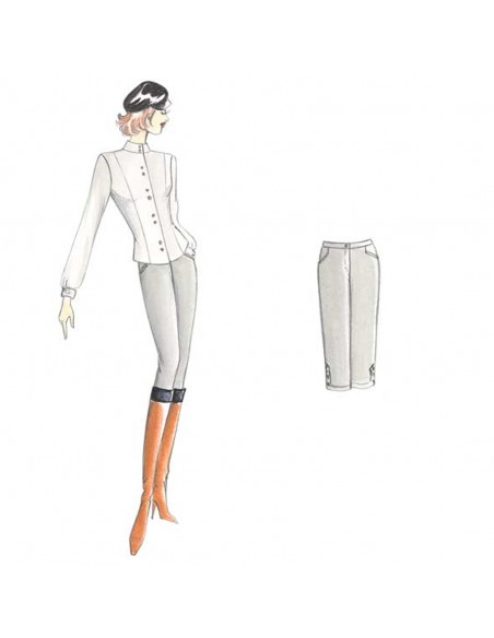 Pantalons au genou de coupe jeans avec au bas une petite fente fermée par des boutons à pression. Chemisier n. 1076.