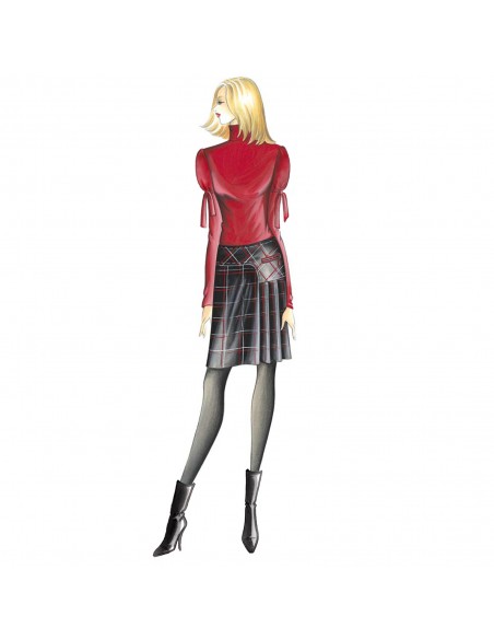Mini-jupe taille basse de type kilt avec une basque façonnée qui maintient un bouquet de plis sur les côtés et sur laquelle s'adapte la poche zippée. Disponible en tartan avec lignes droites et biais, en moleskine ou en denim. Blouse n. 7076.