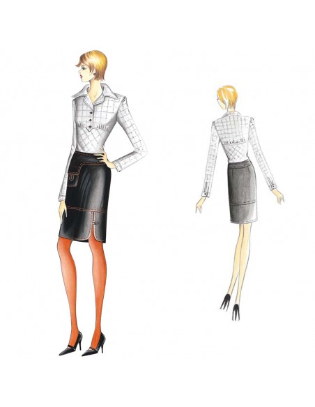 Blouse conseillée en jersey écossais ou fantaisie pop, col chemisier avec ouverture polo jusqu’à la coupe empire et manches légèrement froncées aux épaules. Jupe n. 1494.