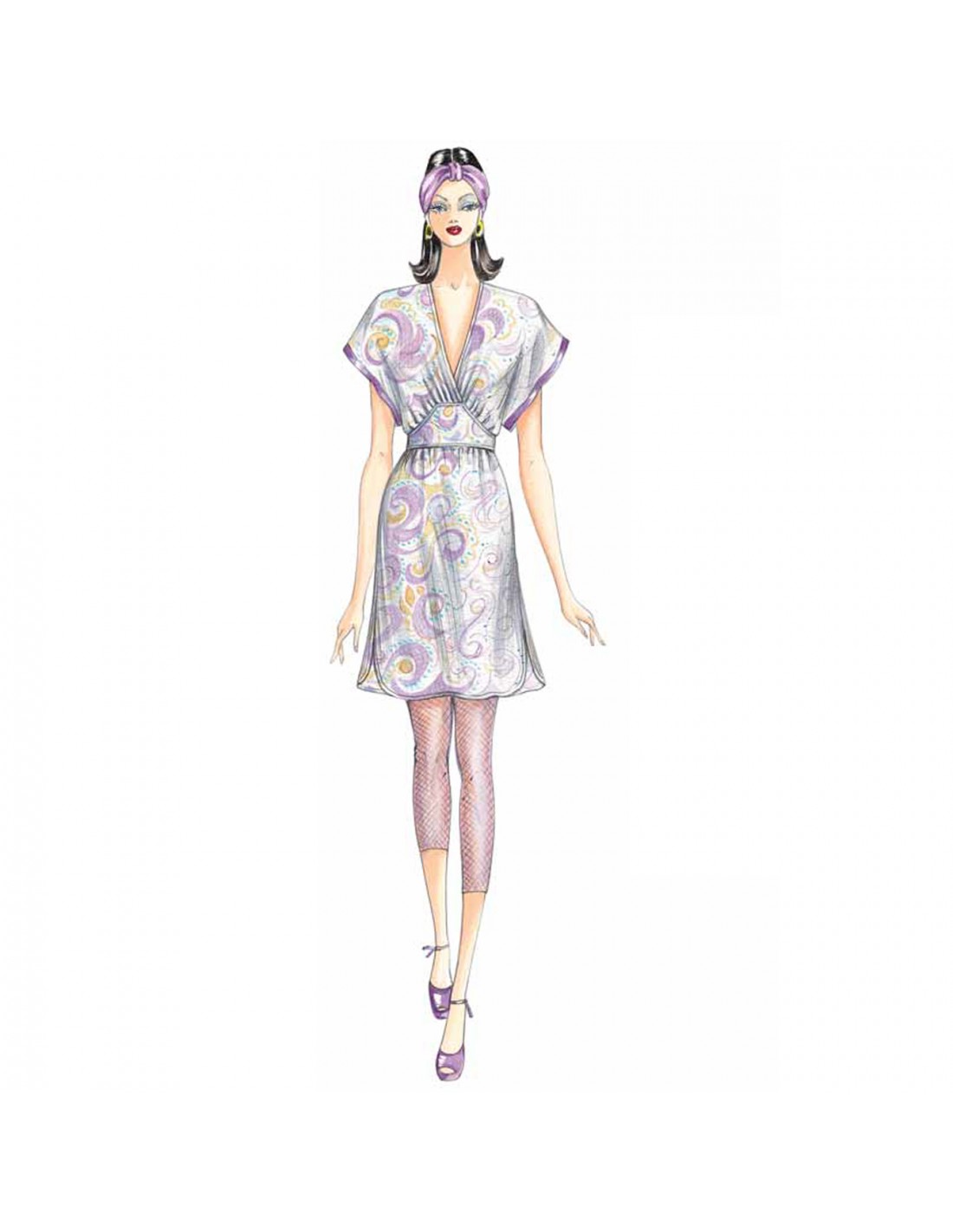 Mini robe d’effet casaque avec ceinture façonnée partiellement insérée qui retient le froncis du corsage kimono, jupe évasée. Réalisable en jersey, satin ou voile.