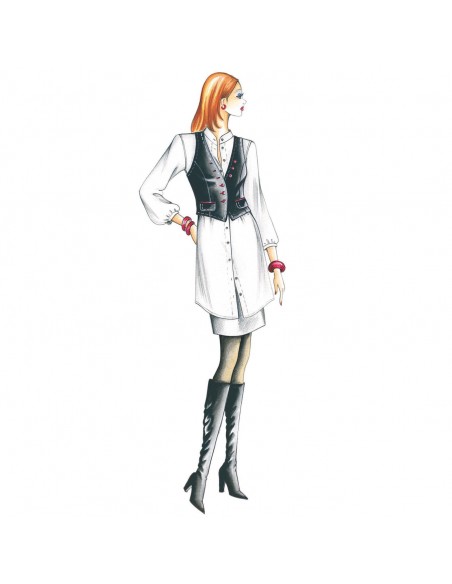 Gilet à réaliser en jeans ou lin avec une particulière emmanchure creuse et rabats appliqués. Blouse n. 0187.