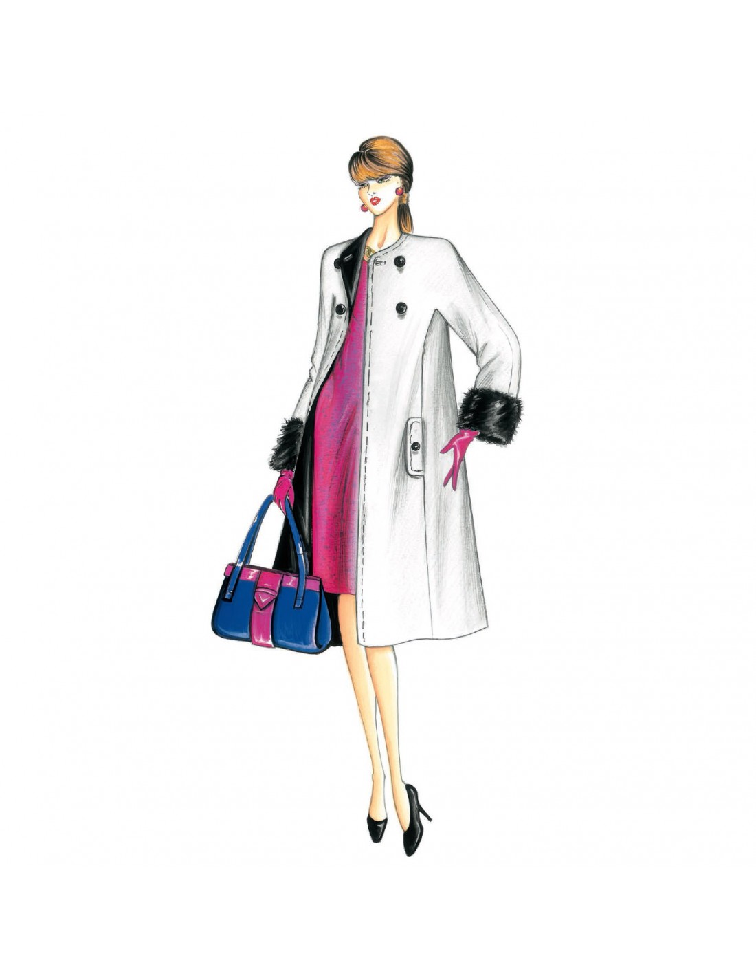 Manteau à double croisement, ligne évasée, ras-du-cou, manches kimono et poches intérieures avec rabats soulevés retenus par un bouton, dos avec pli creux. Réalisable en double cachemire ou velours. Robe 3312.