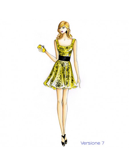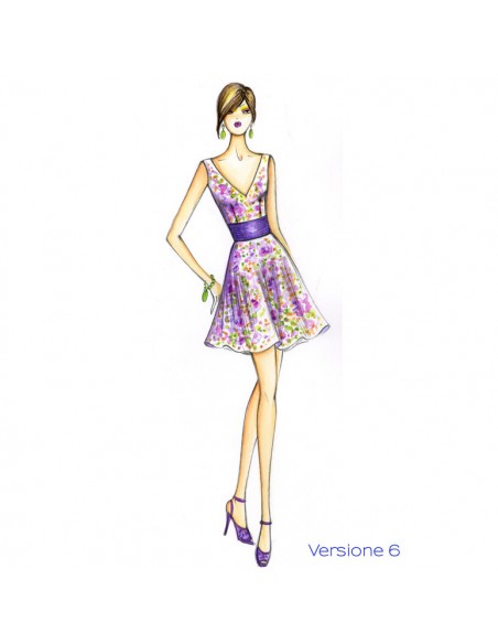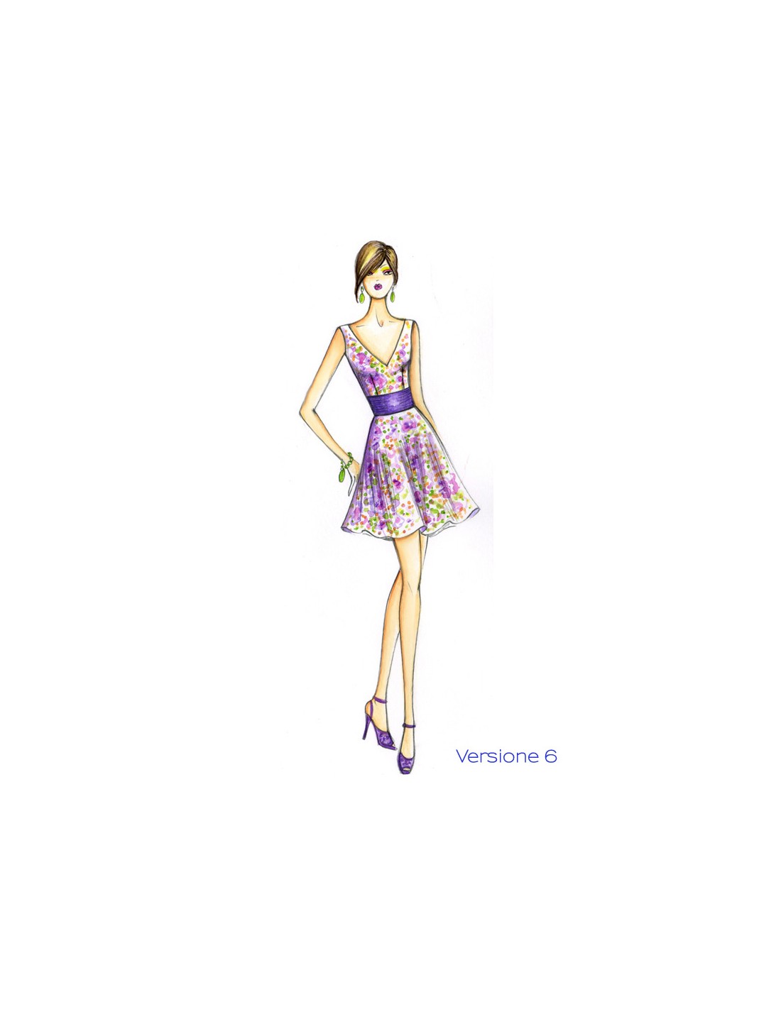 Teintes solaires et fantaisies à fleurs pour la robe au corsage moulant sans manches avec large ceinture à la taille, réalisable en plusieurs versions : avec encolure carrée, avec empiècement en tulle ou mousseline de soie et décolleté droit sur encolure en V. La jupe cloche peut être mini ou au genou, aussi avec une large bordure transparente au bas. Réalisable en crêpe de chine, satinette, satin, coton fantaisie ou piquet, avec ceinture, bordures et empiècement en mousseline de soie ou en teinte contrastante.