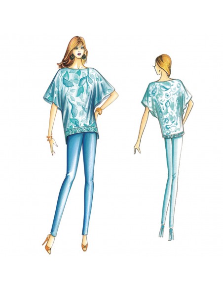 Casaque à réaliser en coton de viscose, satin ou chiffon, amples manches kimono, encolure bateau, ligne resserrée vers le bas allongé dans le dos.