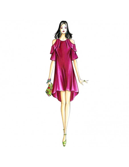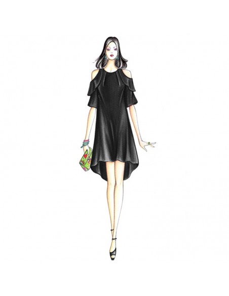 Mini robe de ligne évasée avec ouvertures “cut-out” à épaules découvertes réalisables avec ou sans volant, manches au coude évasées, pinces à l’encolure et ourlet descendant dans le dos. Pratique, chic, idéale pour toutes les tailles, facile à coudre, sa versatilité permet de la réaliser dans de nombreux styles et elle peut être portée autant seule que sur un panta skinny.