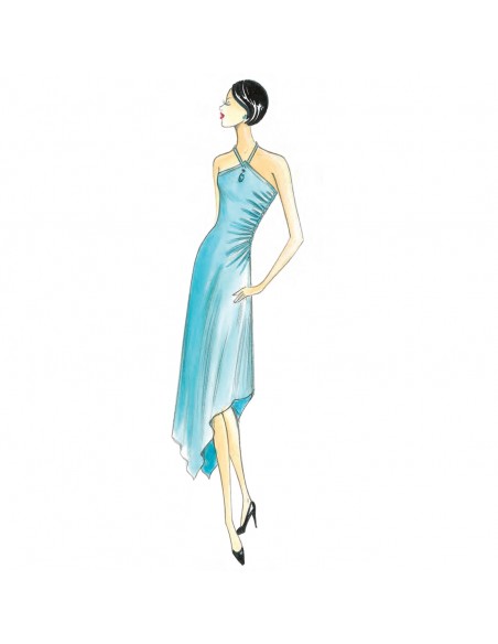 Robe style années ’20 drapée sur le côté, une large fente s’ouvre sur la jupe asymétrique à trois pointes de longueurs différentes. Aussi réalisable en version combinaison sans empiècement de dentelle.