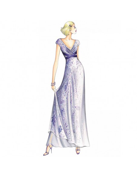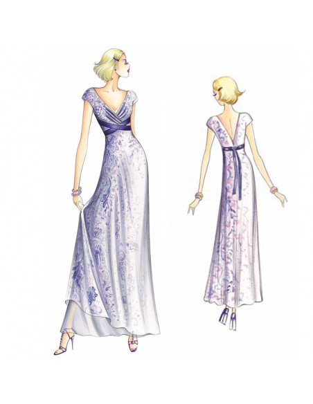 Longue robe empire de ligne moulée avec jupe en biais et corsage au profond décolleté en V drapé en croisement double, coupe empire soulignée par des rubans croisés et noués dans le dos. Réalisable en jersey, mousseline ou satin doublé de voile.