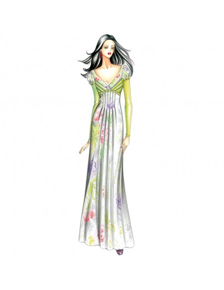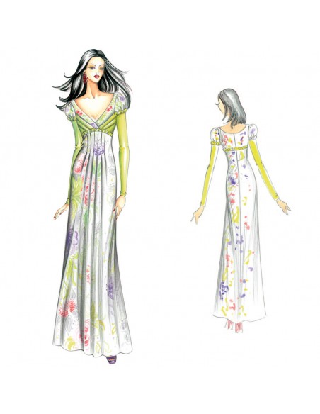 Robe de soirée à réaliser en diverses teintes fantaisie, corsage avec une large encolure en V et plis en diagonale, jupe avec un groupe de souples pinces. A réaliser en satinette et tulle de coton ou viscose.