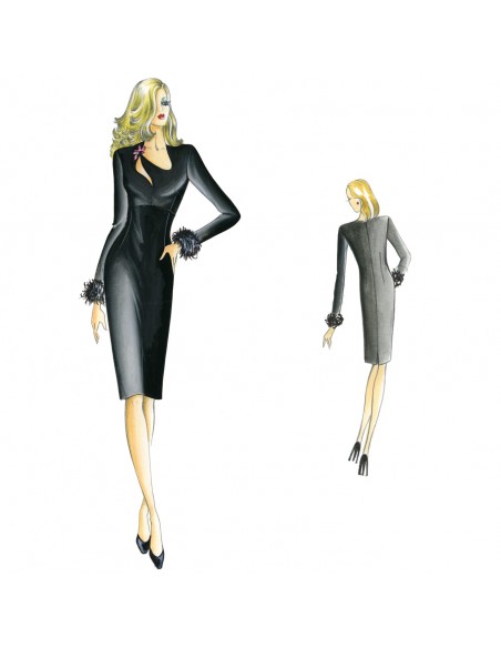 Robe fourreau moulée, coupe empire et décolleté avec ouverture cut-out, à réaliser en velours ou en crêpe, avec ou sans poignets à plumes.