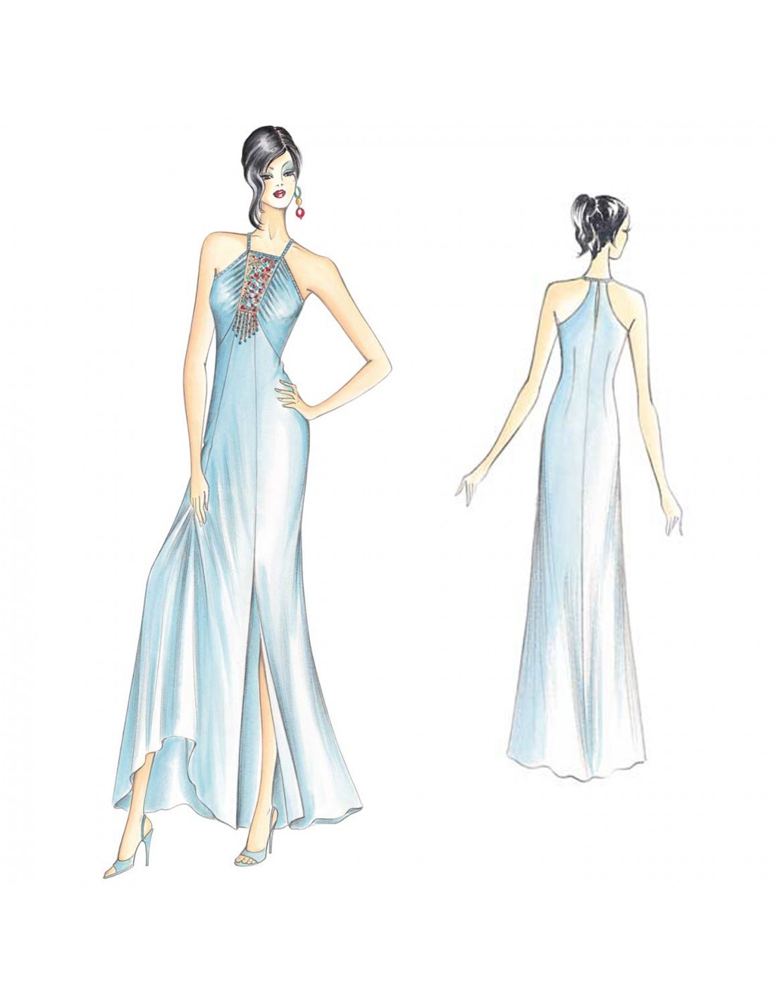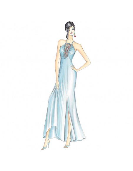 Longue robe combinaison avec empiècement sur le milieu en organdi brodé, retenu par des bretelles et deux pans en oblique légèrement froncés, jupe divisée en pans fendue sue le côté. Réalisable en jersey, crêpe ou satin.