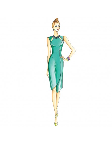 Robe droite avec un motif de fissure sur le corsage et encolure avec perles colorées, jupe à l’ourlet arrondi et pointe allongée, conseillée en satin ou velours.