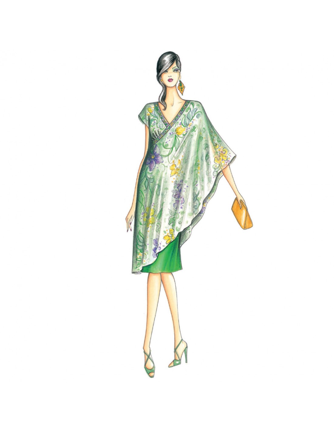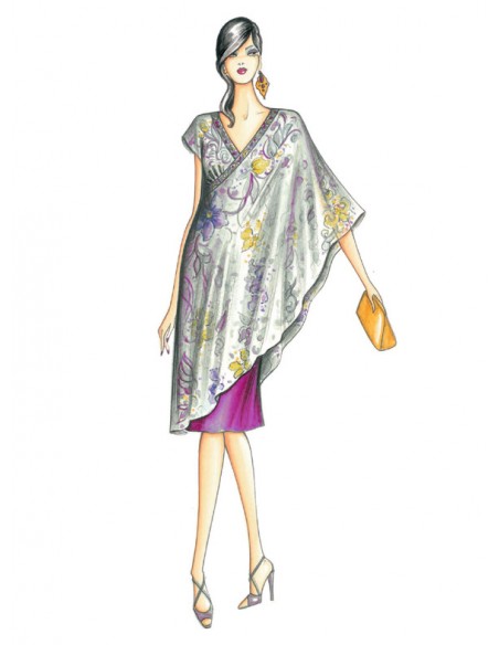 Effet sari pour la raffinée robe-combinaison à réaliser en satin sur lequel se superpose la cape asymétrique arrondie qui descend en diagonale en voile, chiffon ou soie fantaisie.