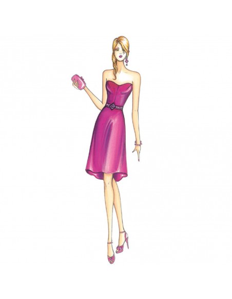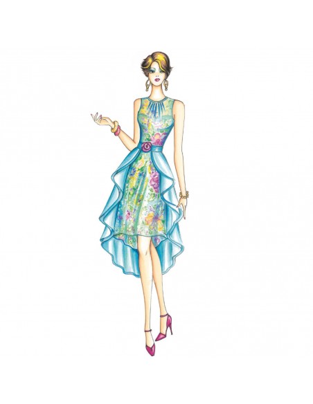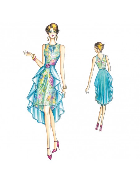 Raffinée robe au corsage moulant, emmanchure creuse, froncis sur l’encolure, top-bustier dessous, taille marquée par une ceinture, jupe évasée avec ourlet qui descend dans le dos, vaporeuse surjupe à deux couches ouverte au milieu et détachable. Réalisable en mousseline de soie fantaisie, organdi ou dentelle chantilly et surjupe en organdi, tulle ou chiffon.