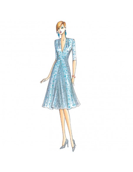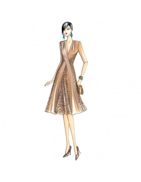 Coupes couture pour la robe de ligne princesse au corsage à pans qui se croisent à la taille et descendent le long de la jupe en tissus alternés, col à plis et manches en gant. Réalisable en crêpe et dentelle.