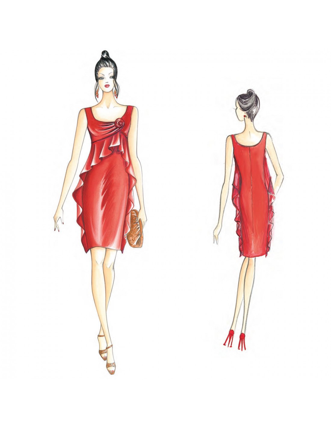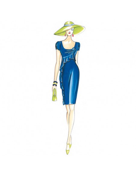 Elégante robe de ligne moulée avec de souples volants qui, partant de la coupe empire, descendent jusqu’au bas de la jupe, corsage avec drapé qui se transforme en rose. Aussi réalisable avec manches. Tissus conseillés: georgette, voile, jersey léger.