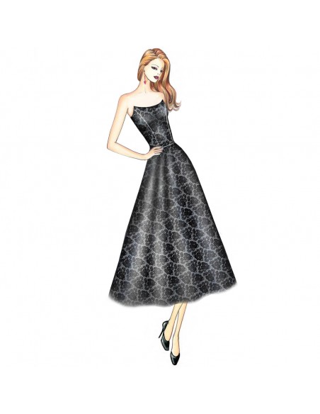 Elégante et tendance, la robe de soirée se compose d'un corsage bustier à l'encolure arquée avec des pointes latérales et d'une demi-jupe. Cette robe peut être entièrement réalisée en dentelle Chantilly ou en taffetas, ou encore avec une double jupe en tulle.