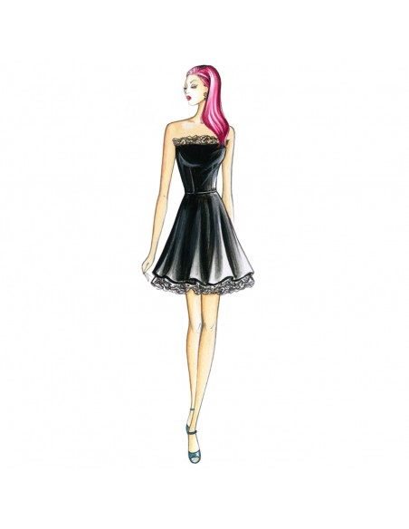 De délicats volants courent le long de l'ourlet et de l'encolure de la mini robe avec corsage bustier et jupe godet avec jupon. Tissus recommandés : crêpe, taffetas ou satin duchesse avec bordure en dentelle de Chantilly.
