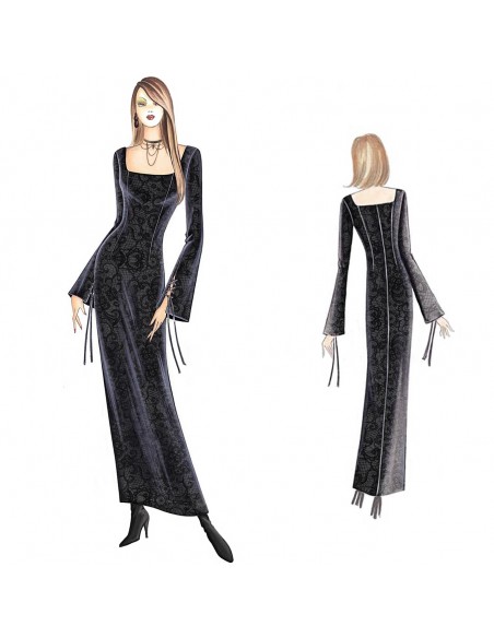 Longue robe de ligne moulée réalisable en dentelle, satin ou velours avec encolure carrée et manches évasées au poignet avec fente fermée par des lacets croisés. Peut également être fait en version mini.