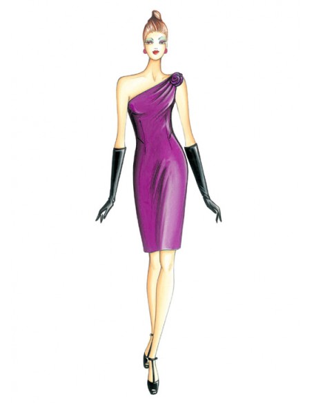 Robe drapée avec une seule manche en pan de mouchoir, conseillée en brocart ou velours stretch et manche en mousseline de soie.