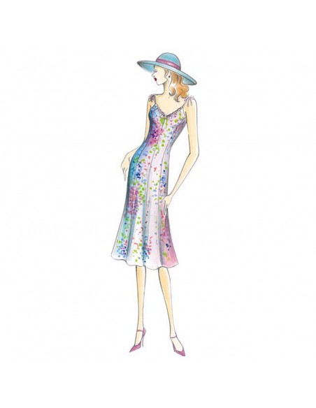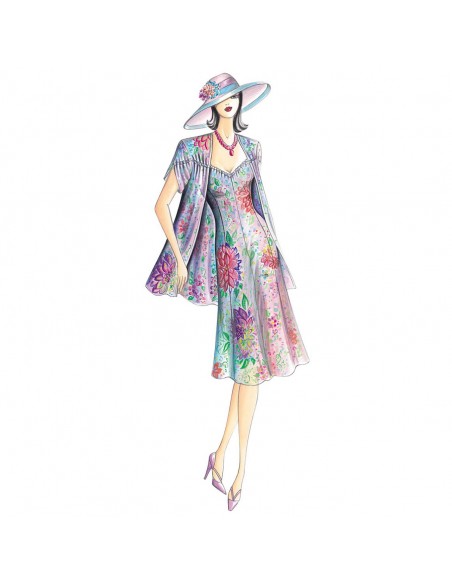 Robe combinaison divisée en lés évasés au bas avec un motif de coulisse sur l’encolure en V dans laquelle sont insérées les bretelles. Veste n. 1200.