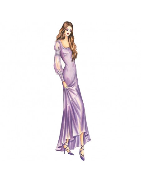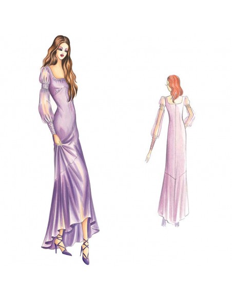 Inspiration folk pour la longue robe avec coupe empire en pointe et encolure carrée légèrement froncée, riches manches avec larges coutures élastiques et volant en biais au bas de la jupe qui descend dans le dos. Réalisable en mousseline de soie, voile ou satin fantaisie.
