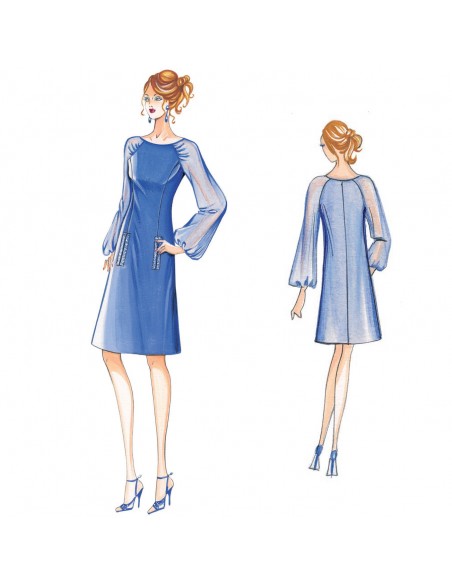 Robe trapèze conseillée en crêpe-satin, brocart ou ottoman, manches en mousseline de soie et poches brodées.