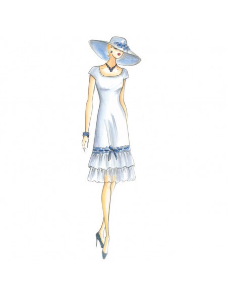 Robe de ligne évasée conseillée en mousseline avec, au bas, deux volants garnis de bord en dentelle chantilly. Veste n. 2756.