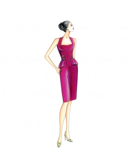 Fourreau moulé avec emmanchure creuse à l’américaine, taille soulignée par un bord en gros-grain multicolore et basque ouverte qui descend dans le dos. Réalisable en taffetas, crêpe, satin duchesse, organdi, dentelle.