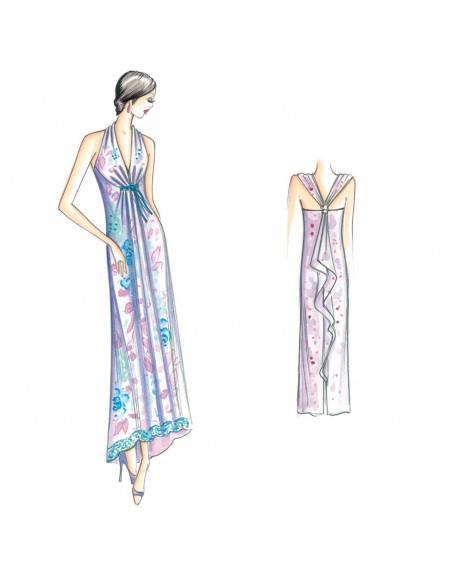Robe longue à réaliser en crêpe ou coton, sur tissu rectangulaire et imprimé foulard, coulisse sous poitrine, encolure en V tour de cou noué dans le dos ou avec motif de bretelles en V.