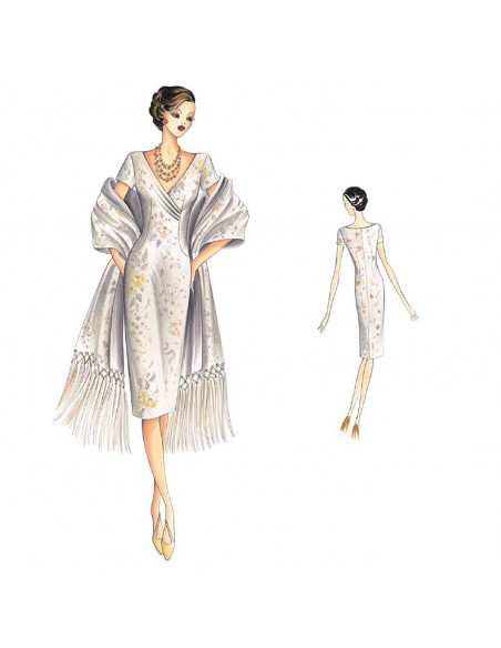 Robe de ligne moulée réalisable en crêpe, jersey ou satin fantaisie avec un large décolleté en V, manches courtes montées et un léger drapé inséré dans une des reprises arrondies.