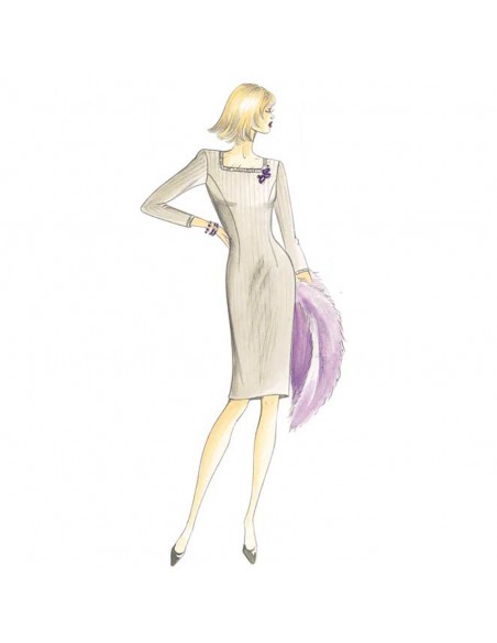 This straight dress has a square neckline trimmed with strass. Jacket n. 9697.